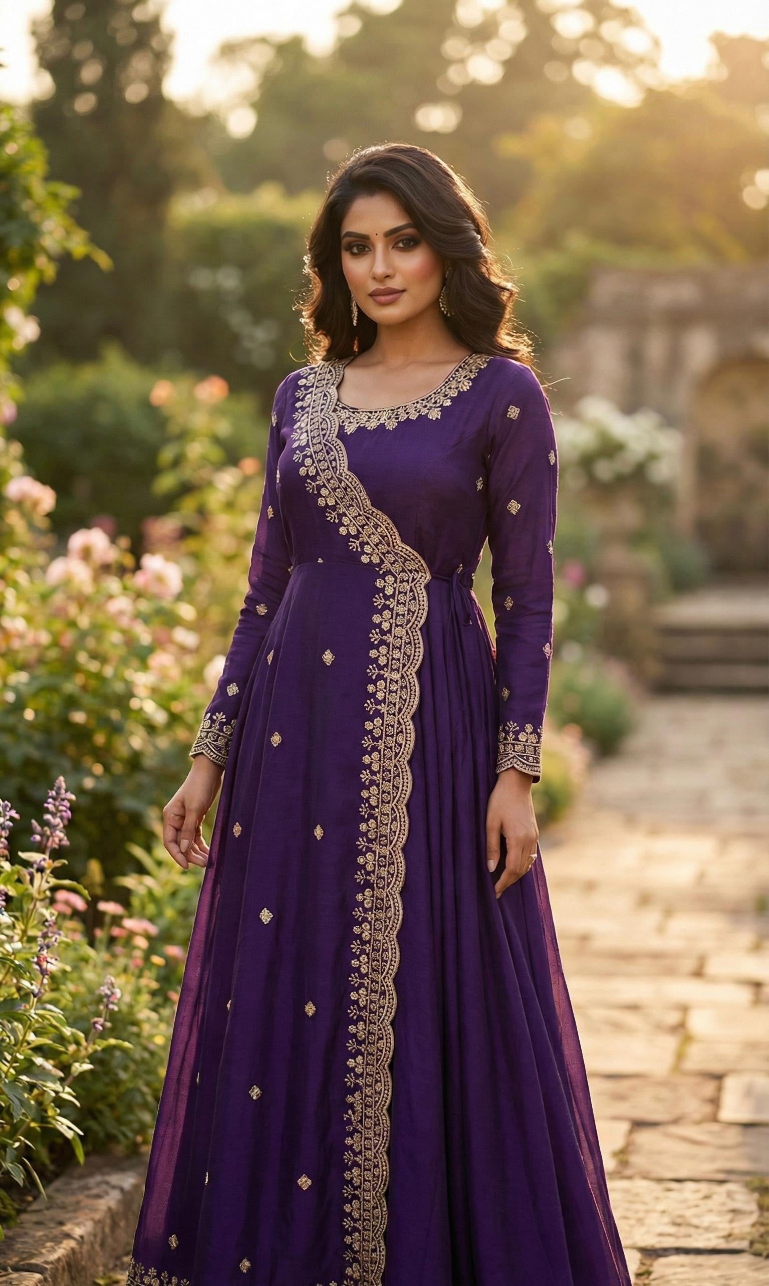 This dress features a sophisticated Angrakha-style long-length dress in beautiful shades blending traditional silhouette with modern elegance. An Angrakha *wrap-around* silhouette, characterized by the asymmetrical overlapping panel that secures at the side with delicate tasseled ties. It is an ideal piece for festive occasions, evening gatherings, or formal cultural events.