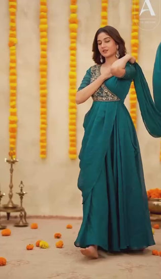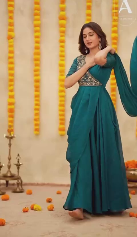 Look As Charming As This Beautiful Unique Style Pre-Draped Saree-anakarli With Beautiful Embroidery, Blouse Epitomizes Party-Ready Chic. It Combines The Grace Of Traditional With Contemporary Design Elements, Ensuring You Shine At Any Party Or Celebration. Embrace the Charming Elegance Of This Drape, And Be Prepared To Turn Heads And Steal The Spotlight Wherever You Go.🙈✨