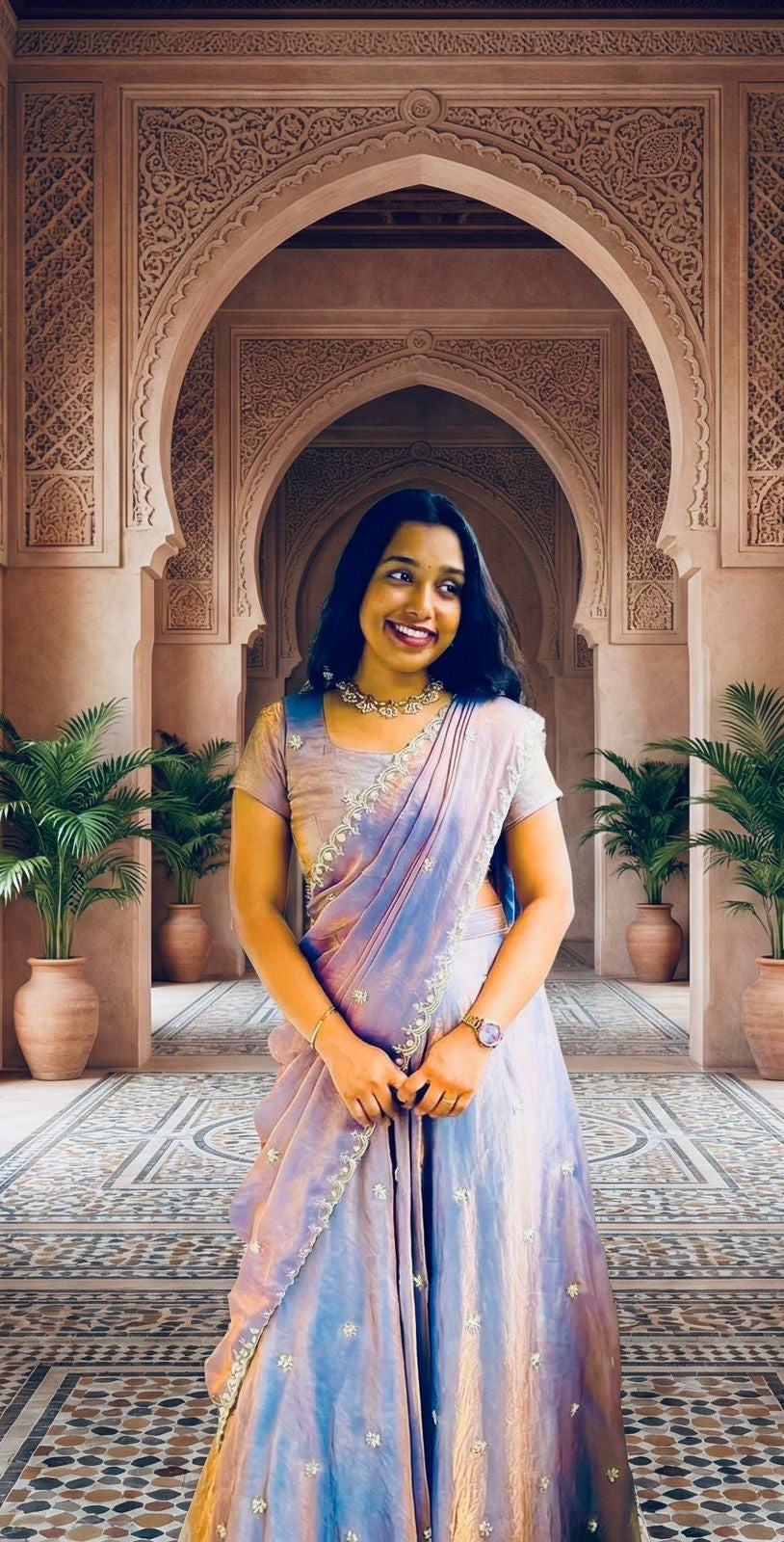This stunning Space Silk lehenga set in *4 colors Red, Pink, Blue & Lavender* effortlessly blends traditional elegance with a contemporary edge.* The *intricate bead work* dancing across the blouse, dupatta, and skirt adds a *luminous shimmer that catches the light from every angle*, while the *pleated design creates a sophisticated, high-fashion silhouette*. With a weighted canvas patta inner for a flawless drape and a generous 2.3-meter dupatta, *this ensemble promises a regal "perfect fall" feel that is as comfortable as it is breathtaking.*