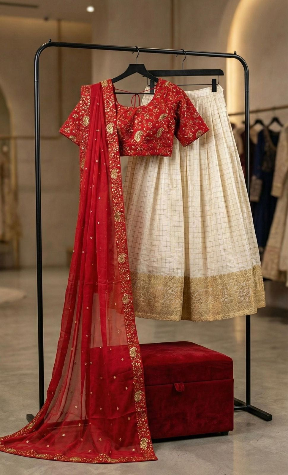 This elegant lehenga set masterfully blends *traditional grace with a contemporary aesthetic,* featuring a striking contrast between a *cream-colored skirt and a rich Wine,/Teal & Red blouse*. The lehenga is *meticulously crafted with subtle golden checks and a broad, ornate border that adds a regal touch* to every movement. Complementing the ensemble is a sheer, *embroidered dupatta and a matching waist belt* that cinches the silhouette for a sophisticated finish. Designed for both style and ease, this outfit is perfect for making a timeless statement at any festive occasion.